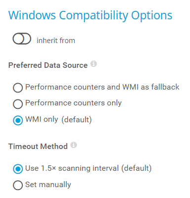 • Compatibility mode (deprecated): Use this only if the default connection mode does not work on the target system. The compatibility mode is the connection mode that PRTG used in previous versions and it is deprecated.